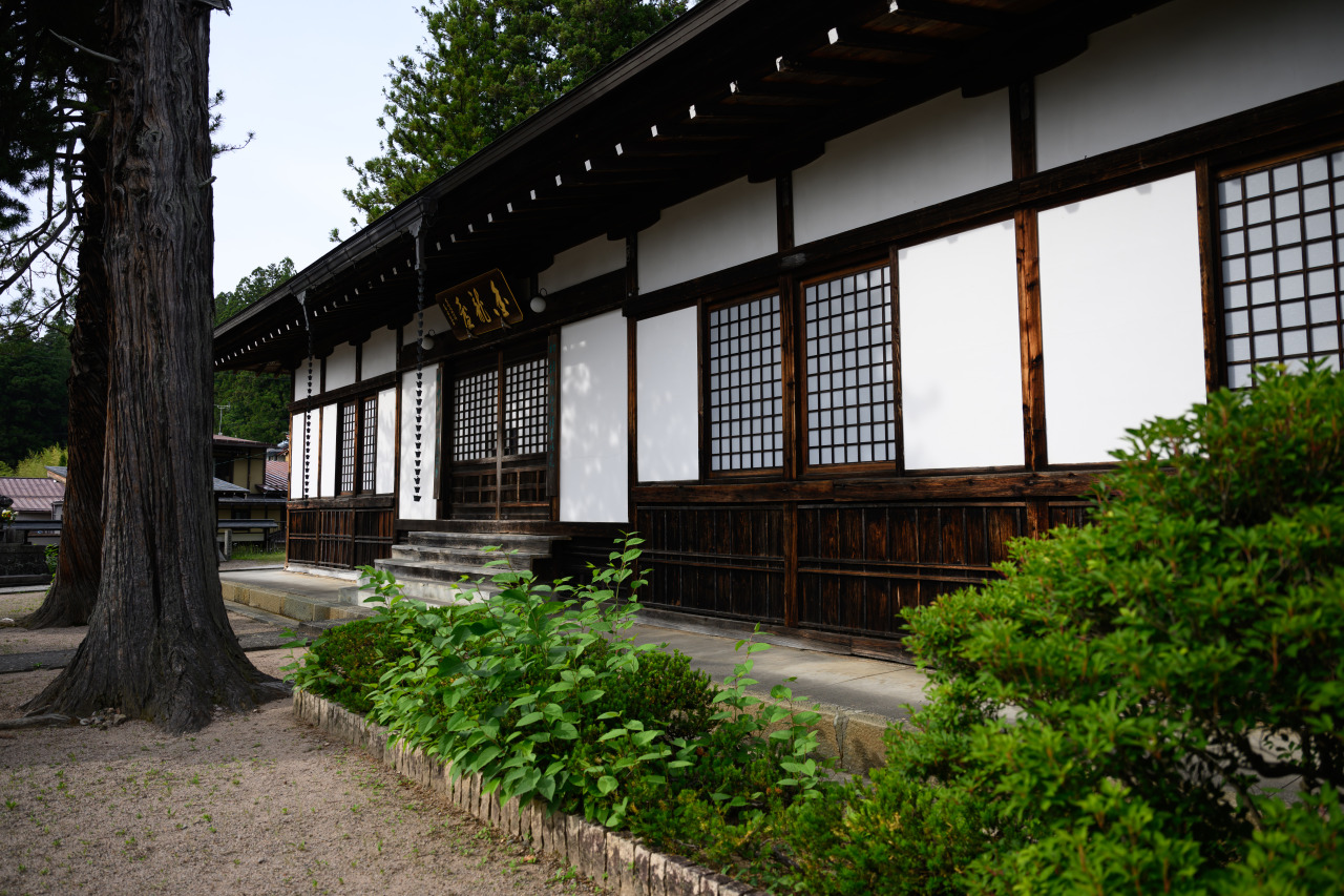 素玄寺の見どころのひとつになっている入母屋造り銅板葺の本堂は、1635年に高山城の三ノ丸にあった評議場を移築したものです。化粧屋根裏の一間通しの板廊下は、もと入口土間でした。一間半の長廊下を隔てて中央に大間と内陣、その右側に4室、左に2室の平面を有しています。大名の屋形を物語るにふさわしい書院造の遺構です。文化財をVRで観る