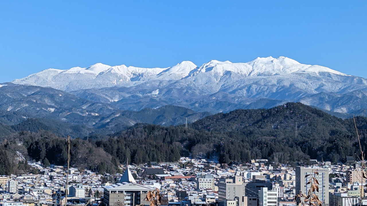 標高570mの市街地を見下ろす高台「アルプス展望公園スカイパーク」。晴天の見通しが良い時は、黒部五郎岳・双六岳・笠ヶ岳・槍ヶ岳・穂高連峰・焼岳・乗鞍岳を望むことができます。無料駐車場があり、目の前がすぐ展望デッキなのでアクセスも便利です。日没の時間には、山々が茜色に染まり七色に変わっていく様を楽しむことができます。