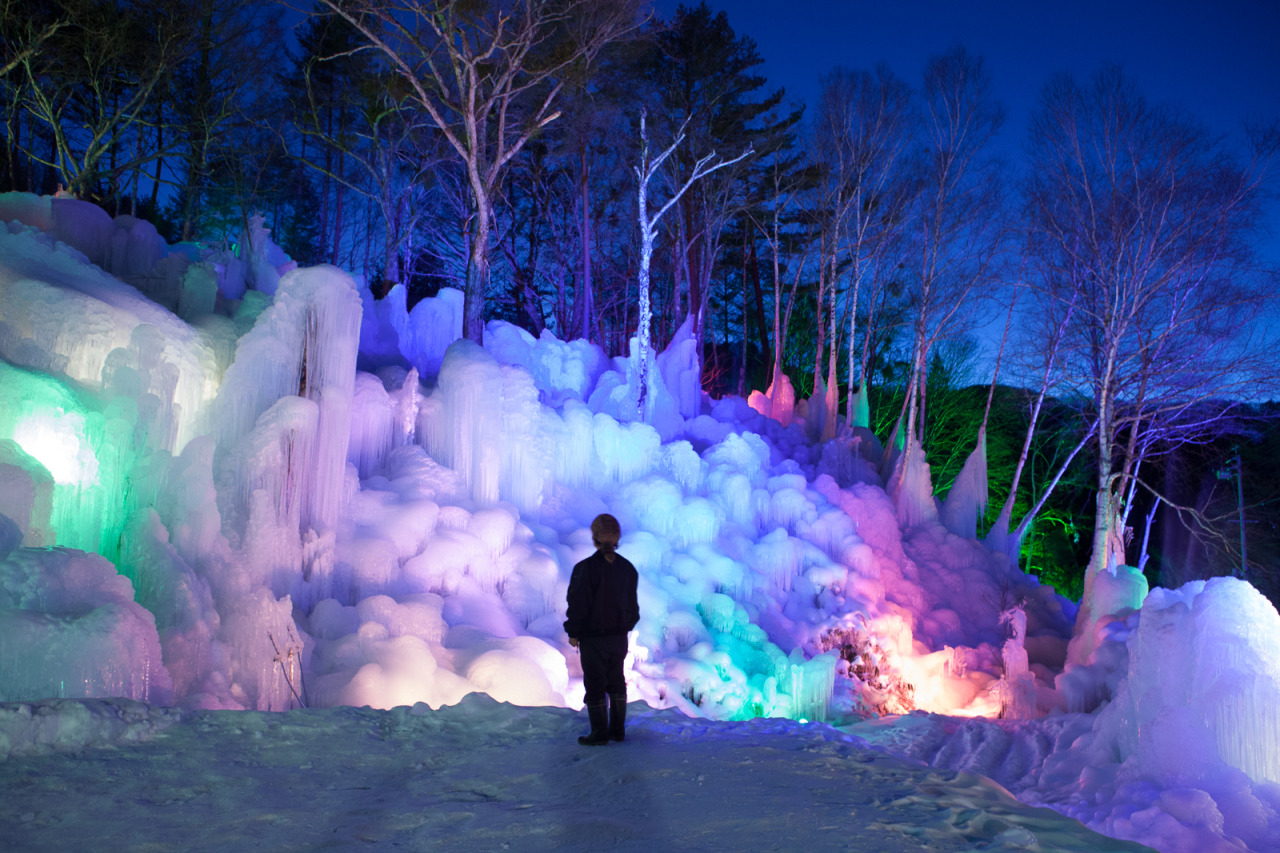 そうして出来上がった氷の森は、昼間にはブルーに、夜にはライトアップされ、幻想的な世界を見せてくれます。毎年2月の第2土曜日には氷祭りが開催されます。