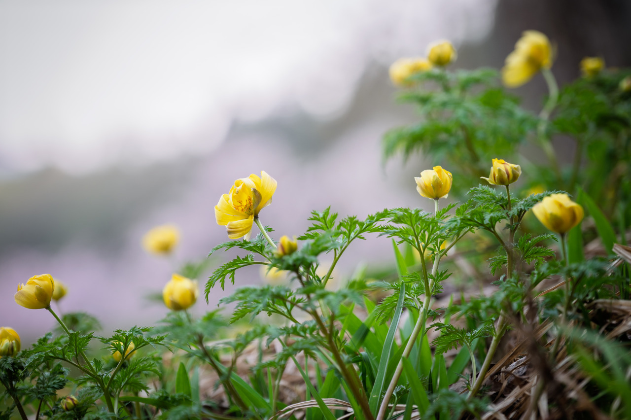 清見町大谷地区の西光寺裏の山すそ約2,000平方メートルの一面に黄色い可憐な花が咲きます。時期を同じくして西光寺の枝垂れ桜も開花することが多く、巨大な枝垂れ桜の薄いピンク色と足元に咲く可憐な福寿草の黄色が彩る景色は春爛漫そのもの。開花は例年4月下旬、山里に訪れる静かな春を楽しむことができます。