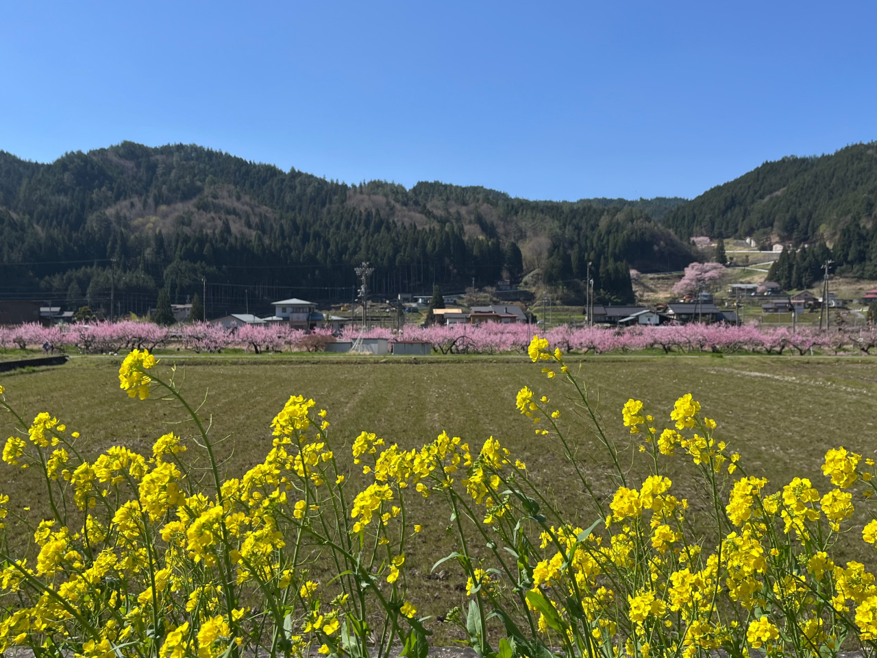 上広瀬は、飛騨桃の産地。寒暖の差が厳しく、ここで育てられた桃は大変甘さが強く、みずみずしいのが特徴です。桜の開花に引き続き、空気もやわらかくゆるむ春、のどかな山里の道沿いに桃の花が咲きほこり、あたりはピンク色に染まります。