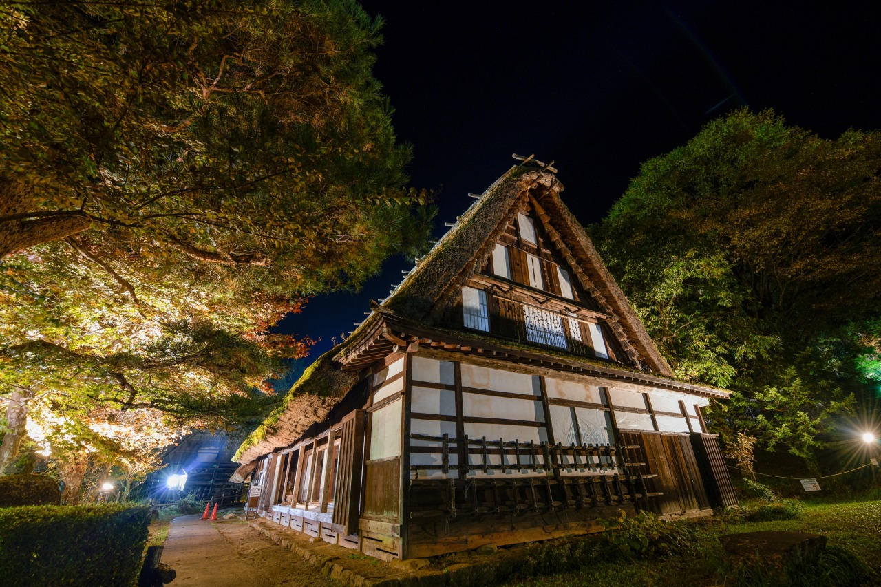 歴史ある飛騨の民家が移築され、昔の農山村の風景が見られる飛騨の里。木々が色づきはじめた里の夜をライトアップで演出します。昔ばなしに入り込んだかのような世界へ訪れてみて。