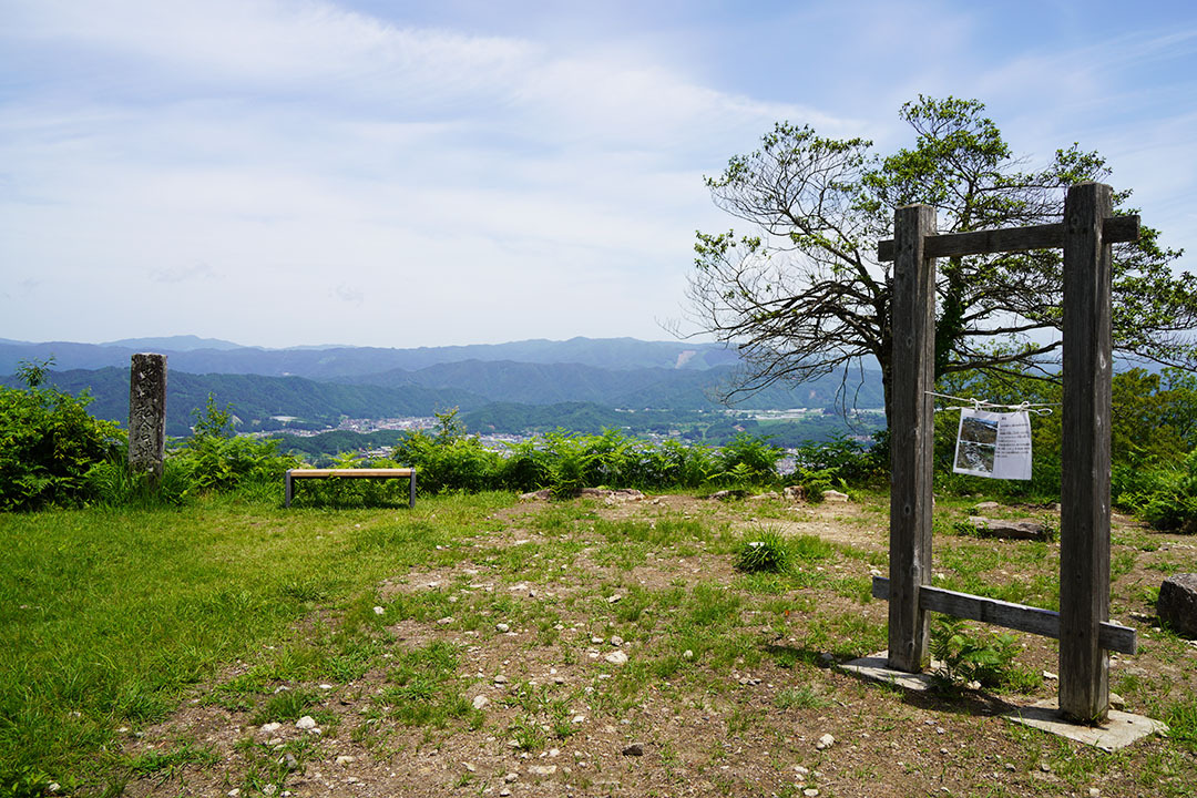室町時代に築かれた山城跡、堀切や曲輪、石垣で囲まれた本丸、二ノ丸、三ノ丸跡が残る