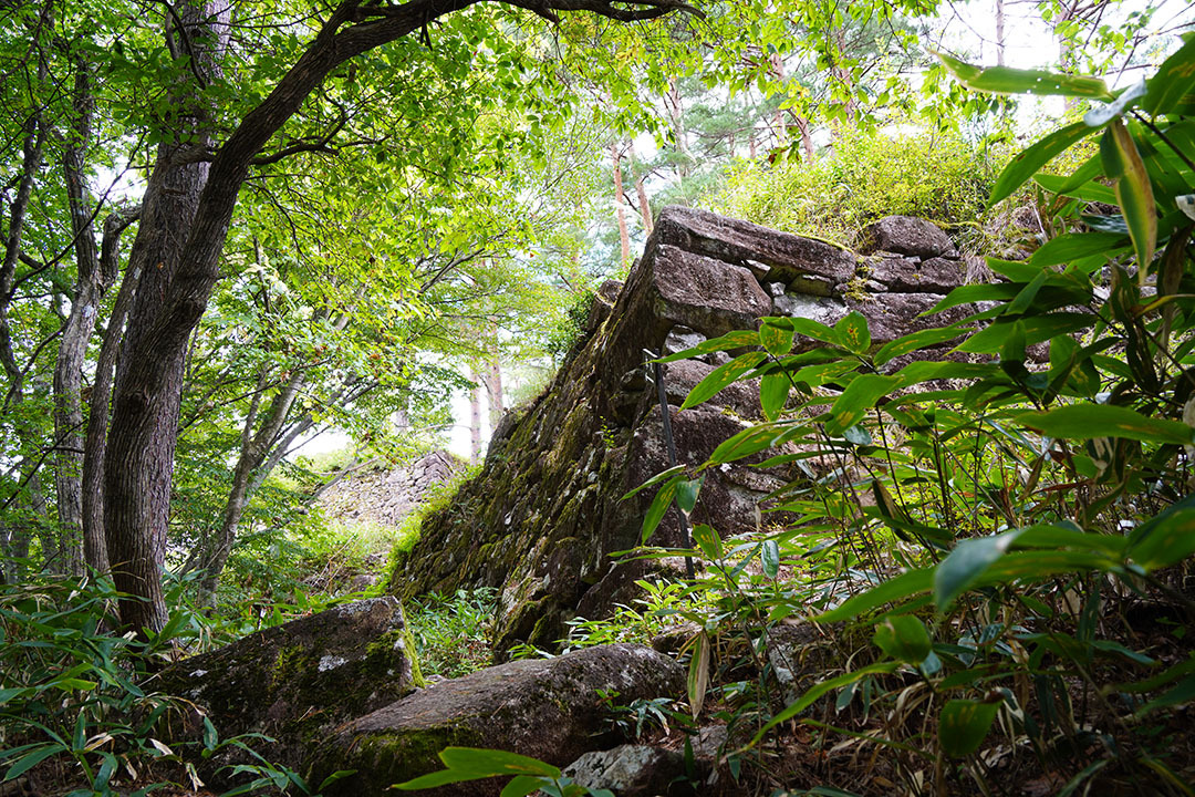 本丸とその南西に伸びる三ノ丸には、5~8メートルの高さで、中には長さ2メートルを超える巨石を用い、隅角部に算木積みを志向する高石垣が築かれています。一方、本丸の東にある二ノ丸では、北側と南側に小型の石材を用いた低い石垣が、東側に大部分を中小石材で築いた2段の石垣が見られます。粗い石積みや竪堀、堀切などを用いて北側と東側を意識した遺構と、高石垣を築き西側と南側を防御しようとする2系統の城郭遺構から、土造りの城から石垣を持つ城への2段階で築城されたことが想定されます。三木氏による当初の築城と、その後の改修によるものと考えられます。
