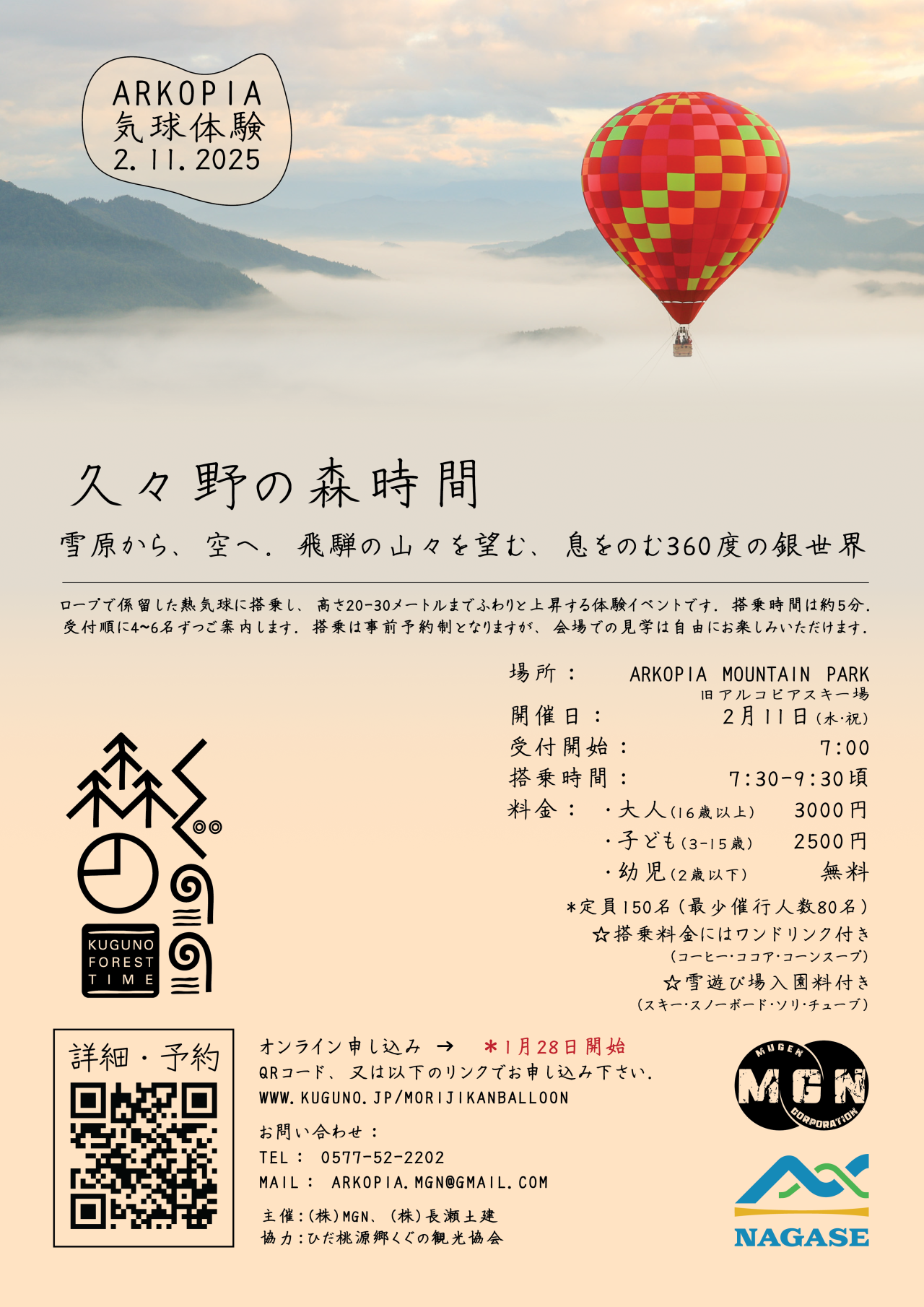 熱気球に搭乗できるイベントを開催します。雪原から上空にあがれば、360度の銀世界に浮かぶ飛騨山脈が現れます。空に浮かぶ特等席を準備しておりますので是非ご参加ください。